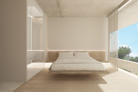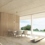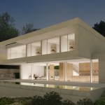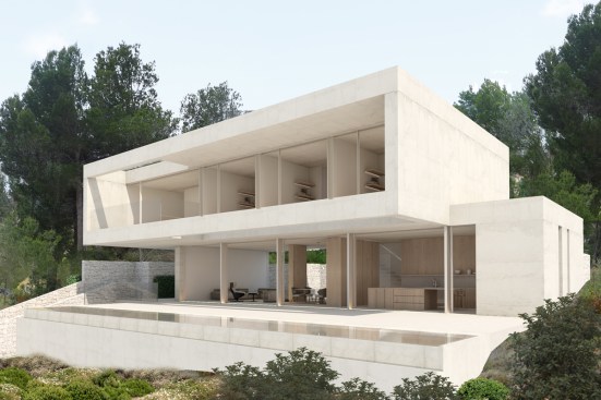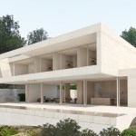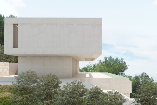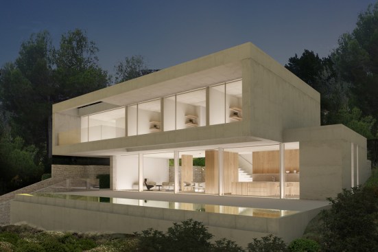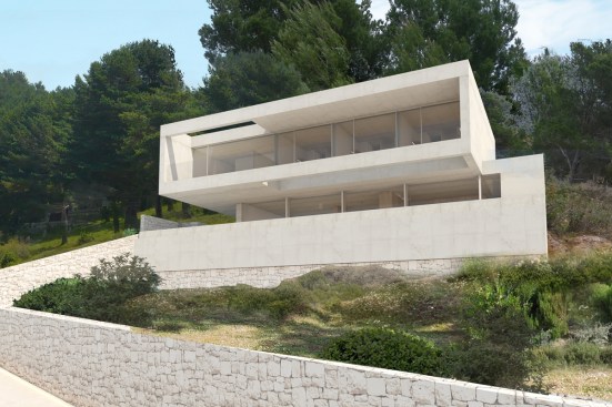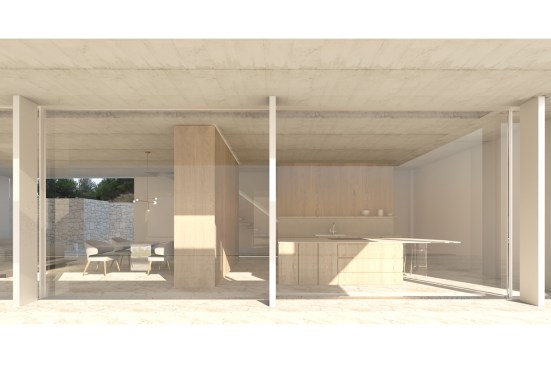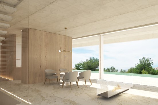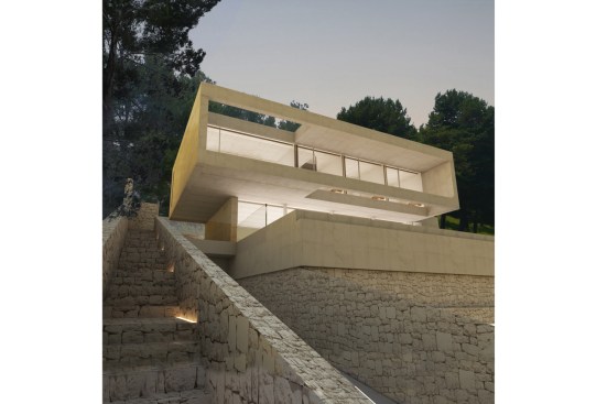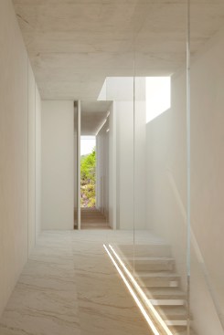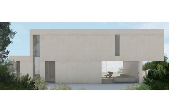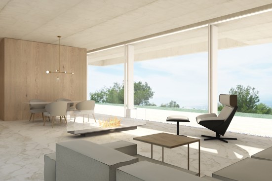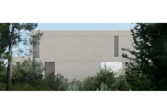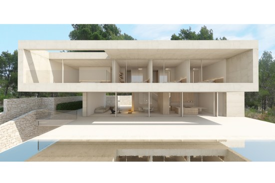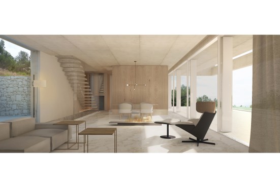 The house opens widely as a viewpoint towards the sea, in contrast to the privacy provided by the rear façade, which includes the entrance to the house. These two boxes contain the regular rooms of a house. The ground floor is an open space where the common areas are delimited by free-standing elements such as the fireplace. The first floor contains the night rooms, including the bedrooms and an outwards-looking terrace.