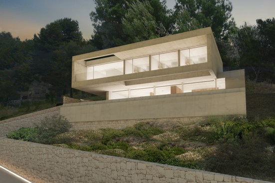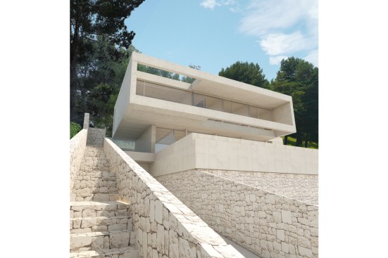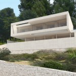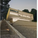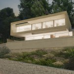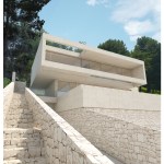 The dwelling is composed of two overlapped bodies that are set back in order to generate a play of light and shadow. This play is reinforced by the openings in the floor slabs, which lean on a stone base adapted to the steep slope of the mountain.