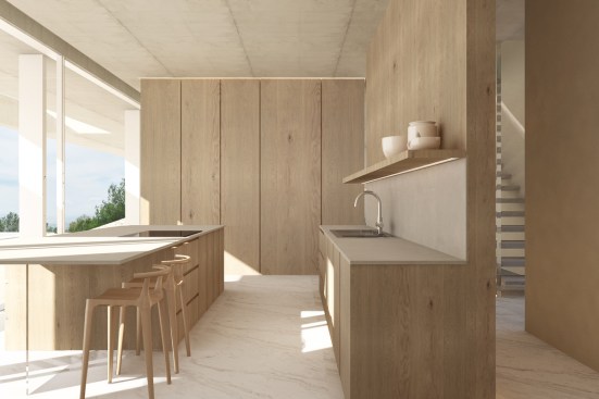 The coldness given by the materials of the walls contrasts with the warmth of the interior caused by the use of large wooden surfaces. The structure is displayed on the façade, so we enter the house walking on the slabs.