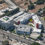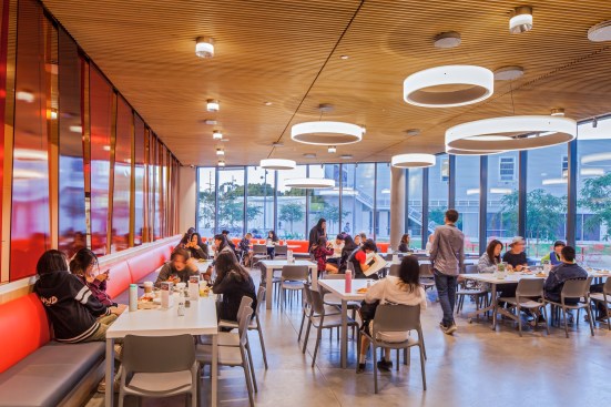 Solar geometry strategies included designing long rectangular masses along with ample vertical glazing provide plentiful daylight within interior spaces, complete with overhangs on level 1 and a green roof above the dining commons. This green roof not only provides visual respite for the residents living in the dorms above, but also helps keep the dining commons cool. Other roof surfaces are using high albedo reflective roof material (sarnafil) and the hardscape is also highly reflective to reduce heat island effect.
