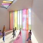 A prismatic use of color, from cladding to glass to interior surfaces, unifies the structure. Transparent layers of colored stain ebb and flow across the exterior wood siding and interior wood paneling—evoking the Waldorf School tradition of veil painting. The diffuse quality of the polychromatic hues, in turn, dematerializes the form so it is at once solid and light. Luminous, colored-glass panels also punctuate the façade, creating a dance of color within.