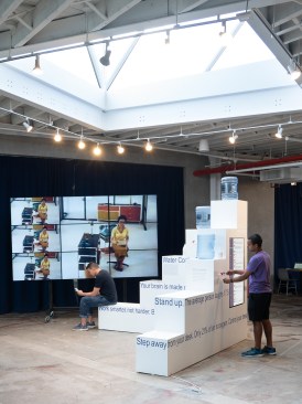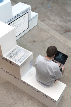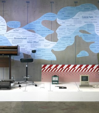 The installation included an exploration of the history of the office with objects tracked on the macro scale on a graphic and object timeline. Two speculative installations allowed visitors to explore an office defined by physical and virtual optimization and choice. Water Cooler Talk recalls the symbolic heart of the office is updated with a live feed from the communication platform Slack. In Wellness 2050, A/D/O’s conference room is immersed in the Windows XP desktop background, with eponymous start-up sound slowed to 24 hours, projecting health and wellness to the extreme.