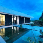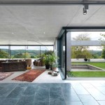 The key architectural device is a rigorous plan organisation separating studio and working spaces on the uphill side and glass fronted living spaces on the downhill side to take advantage of spectacular views. The building’s backbone is a linear circulation space driven through the plan perpendicular to the site slope, with the front door at one end and Wales at the other. The entrance is a modernist set-piece with a covered approach flanked by a black pigmented concrete pavilion and a simple solid open stair running through a rectangular puncture in the roof plane. Channelled views through the glass door reveal the spine, active as a gallery space opens to and illuminated by the living space on the downslope side. Fleeting glimpses of the retired owner’s traversing the house on micro-scooters confirmed the very definite feeling that we wanted to enter.