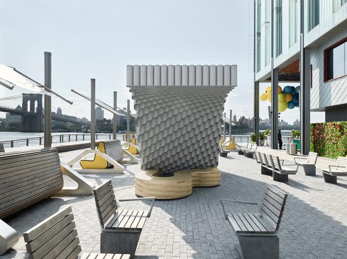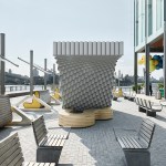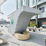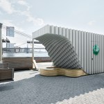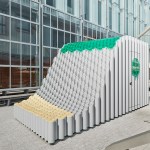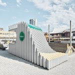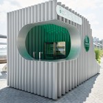 The kiosks were conceived from a solid block that was split by a sinuous curve in order to achieve two volumes. One half, “Over,” provides shade while “Under” slopes downward to create a bench. Both are topped with a green acrylic roof that filters the light and alludes to the Heineken brand.