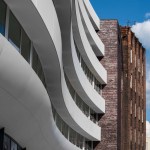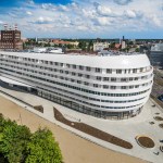 The OVO Wroclaw creates a new vision of urban living that unites 180 luxury residences, a five-star DoubleTree by Hilton with 189 rooms and suites, corporate offices with high-end retail spaces within a modern and sleek rounded exterior that seamlessly blends the curved lines of the building with a stylish minimalism that typifies the interior spaces.
