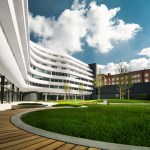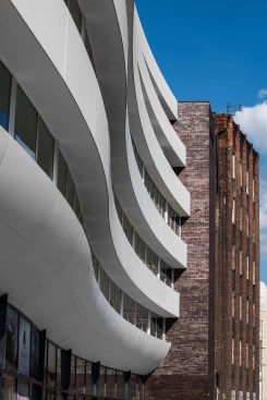 The amorphic design that was envisioned required alternative building techniques in order to be properly realized. After considering various options, Gottesman-Szmelcman Architecture chose to clad the building in Corian panels. According to Asaf Gottesman, the particular form of the building is a result of the traditional urban guidelines of the city of Wroclaw and the desire to envelop the diverse set of spatial requirements within a unified skin.