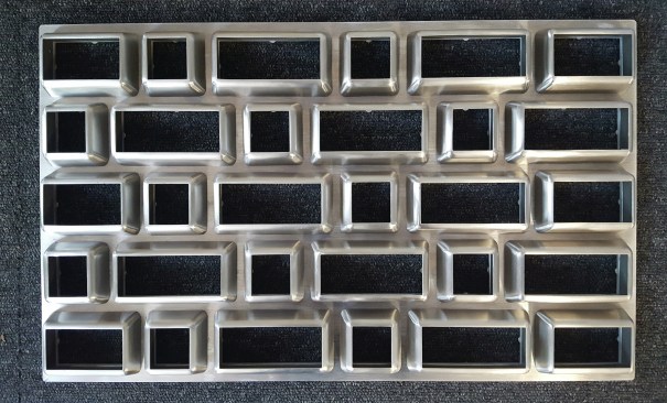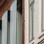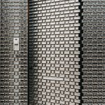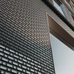 The stainless steel bricks are cast in different sizes, following a similar pattern to the traditional brick facade on the upper levels. The individual stainless steel bricks are precisely mounted onto larger steel frames, then installed on site. Operable glass windows behind the steel brick facade allow for maintenance and cleaning.