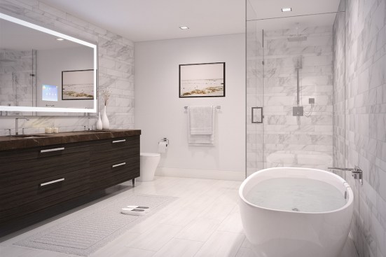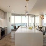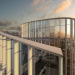 An unprecedented sleek residential tower design is achieved by the thoughtful unit and balcony layout without a sacrifice of desirable balcony space for each unit. The oval shaped tower is oriented east-west to minimize its exposure to western sunlight, while maximizing the downtown view corridor towards the waterfront. Vertical painted metal fins accentuate the tower’s verticality and help to enhance the energy performance by blocking solar heat gain from western/eastern sunlight. High performance insulating glass units with low-e coating are applied throughout the building and warm beige limestone is selected for the podium to complement the color pallet of the historic downtown.