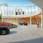 The double height commercial/retail space occupies the ground floor along Broadway and Pacific Highway. A strong street wall along Pacific Highway is provided by the tower and the podium. The podium has varying street wall heights of 35’ to 55’. Public open spaces along Pacific Highway are created by the change of podium wall curvature in varying depth, and activate the commercial/retail spaces. A generous residential entrance court smoothly flows in from West E Street along the gracefully curving podium wall. All vehicles will enter the project from West E Street. Entrances for the underground parking and ground level loading area are located mid-block on West E Street, while a ceremonial residential drop-off is more privately located at the end of the street. There are three Levels of underground parking.