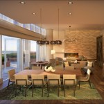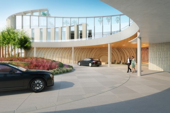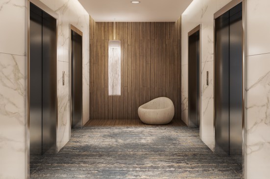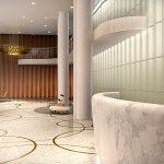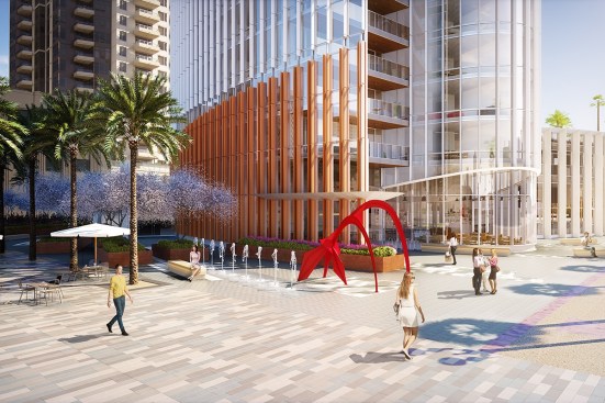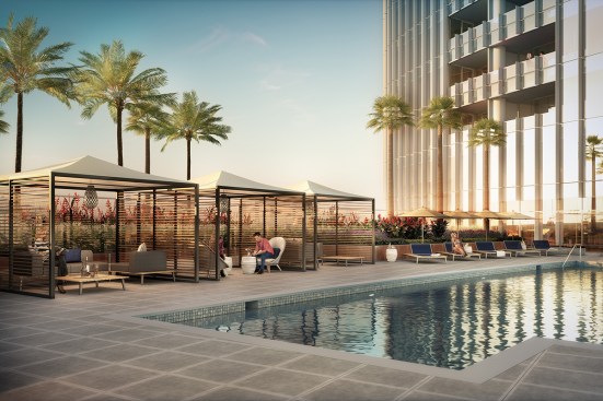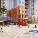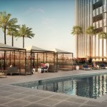 Landscape plays an important role on the ground plane, on various roofs of the podium, and at the top of the tower. A large resort style pool deck on level 4 is protected from wind and noise by spiraling glass and limestone walls which allow the podium to express a harmonious architectural language with the angled tower top. Large numbers of planters and green vertical planted walls provide well shaded human scale common spaces. The common space can be accessed easily from indoor amenity spaces on the same level and from the fitness center on the level below. The public plaza along Broadway not only provides public shelters with two rows of tall palm trees, a variety of plantings, and seating, but also becomes an inviting place of interest with active water features, exciting site furniture, lighting, and large scale public art.