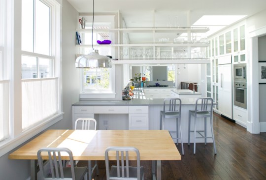 The building is set off the south property line, which allowed the addition of numerous large windows along the length of the house. New skylights on the north side flood the interior of the top floor and the long hallway on the second floor with natural light. Open-riser stairs, a light well, and interior windows also allow light to filter down to the second floor hall.