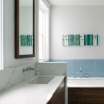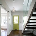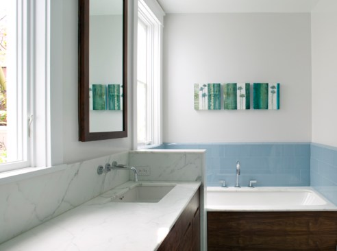 Throughout the house modern elements are combined with the traditional in an unexpected manner. For example, a steel and glass staircase and garden wall, modern lighting, wallpaper, tile and cabinetry are set against traditional wainscoting, trim, and rustic wood floorboards.