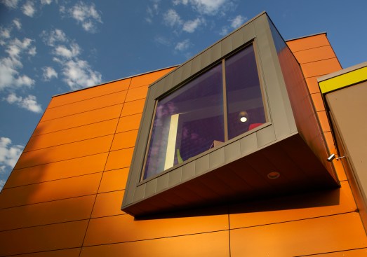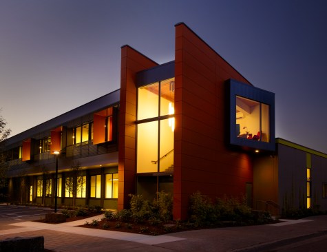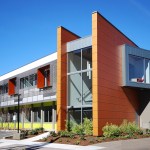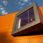 The exterior of the building’s newly constructed stairwell is composed of high pressure laminate panels. The panels continue from the exterior to the interior lobby space and soften the transition from outside to inside. In addition, they define the new building from the existing. The new metal solar shade on the south façade helps minimize solar heat gain during office hours, while the articulated window boxes mimic camera hoods used in video production and provide views and access to daylight.