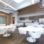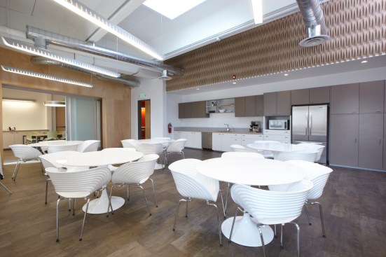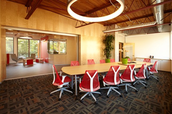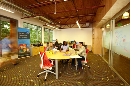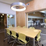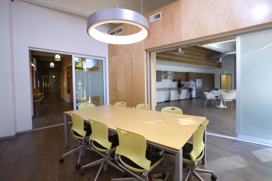 Encouraging teamwork and cultivating creativity was one of the main design goals for this project. The meeting rooms include large sliding glass doors to provide flexible space, while the large stairwell offers generous landings and seating for people to meet and share ideas.