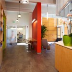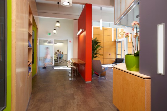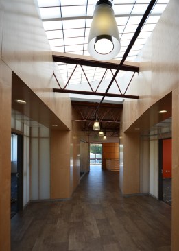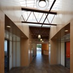 A palette of industrial and non-precious materials was selected to complement the existing structure. The walls are constructed with exposed plywood panels and brightly painted accent walls throughout the central circulation spine to define the building core. The flooring is functionally durable with patterns that are conceptually inspired by pixels and film strips. The mechanical ductwork and scissor trusses are left exposed to celebrate the industrial history of the building.