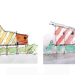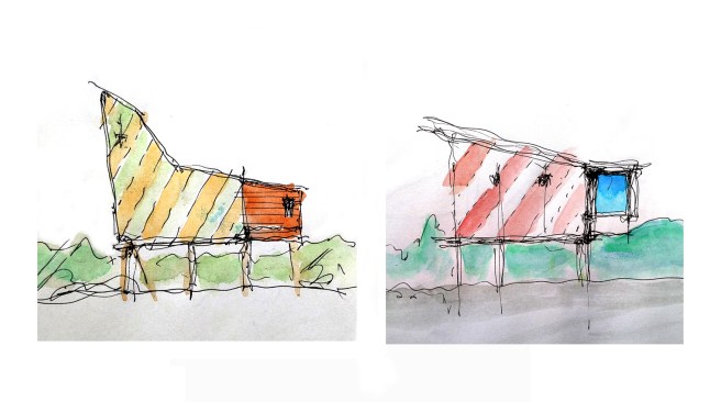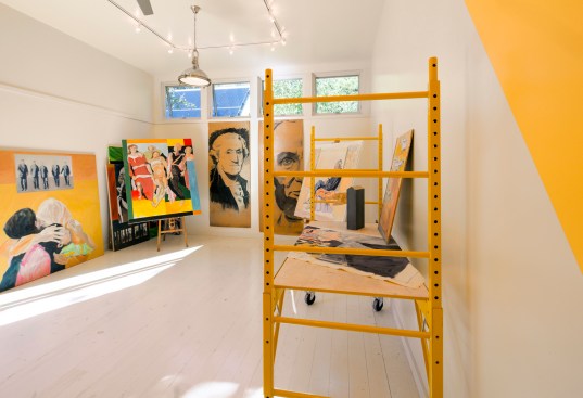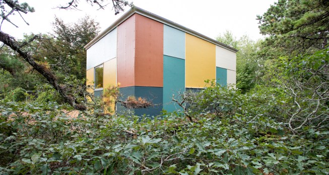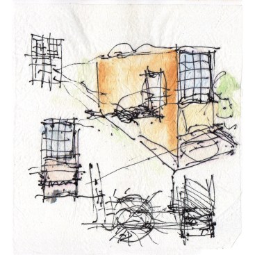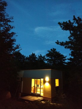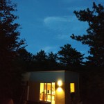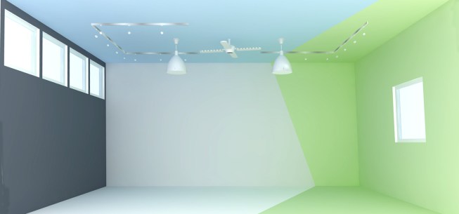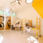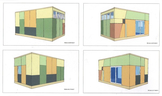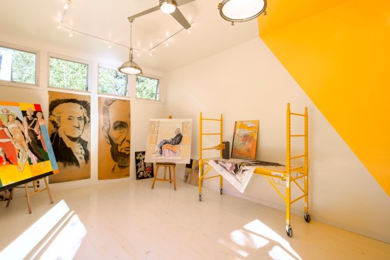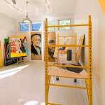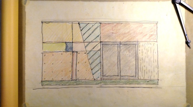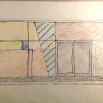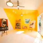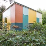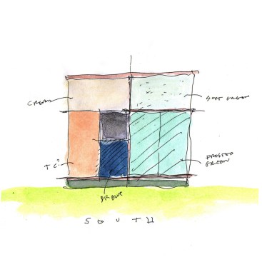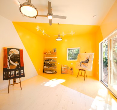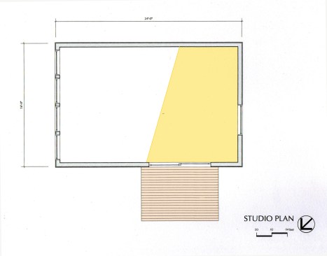 The project, a 16′ x 24′ painting studio, is situated on a small residential lot between two primary structures: the residence to the rear, and an architectural office near the street entrance. The long North-South axis of the studio parallels the side lot line, and marks the edge between dense natural vegetation along the lot’s border and an informal landscaped garden space that unites all three structures. The project is a meditation on the relationship between painting and architecture, playing on the inherent tension in paintings wherein three-dimensional space is represented on a two-dimensional surface. The studio is in a sense a reversal of this condition, in that its simple volumetric configuration is contradicted by the treatment of each elevation as an autonomous composition or “canvas”. At the same time, some of the painted concrete sheathing panels appear to wrap around corners, suggesting a set of smaller sub-volumes nested within the studio’s overall cubic structure. Thus, as in some paintings, the notion of volumetric presence is expressed at the same time as the two-dimensionality of surface is affirmed. In the nearly 12-foot high interior, clerestory windows are set along the top of the short north wall, while the long east wall is unbroken by openings, providing wall space for working and display. A large sliding glass door to one end of the west wall provides access to a small deck and the landscape. Like the treatment of the exterior panels, the simple interior finishes are intended to subvert a simple reading of the studio’s volume. The walls, floor, and ceiling are all painted the same color – yellow at the south end, reflecting the primary source of daylight; and linen white elsewhere. The diagonals marking the edges between these color fields are intended to disrupt the static quality of the volume, creating a dynamic spatial condition as one moves into and through the space.
