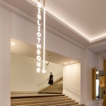 Les matériaux nobles, encore présents dans le hall, sont préservés comme témoins du passé. L’enveloppe lissée sous un même fond, unifie les ressauts grâce à un enduit fin et mat, structurant ce décor d’une mono-matière.