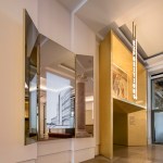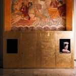 Un mobilier vient compléter l’affichage et la signalétique du lieu. De grands triptyques, démesurés à l’image du lieu, composés d’un écran sous miroir, bordé de deux panneaux en feuilles d’or, peuvent, au gré des usages, refléter ou informer.