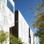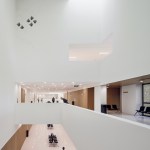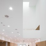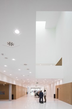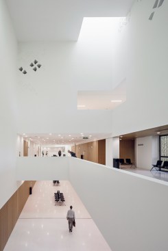 From the main entrance, the interior organization is easily recognizable. A central spine creates a circulation axis which connects to the various the programs of the building. This space spans through several floors across the length of the building and articulates each department. It also links the public circulation with the exterior patios. The spine echoes the architectural language of the exterior massing, with multi-level day-lit voids creating sculptural atriums throughout the building.