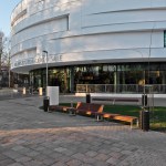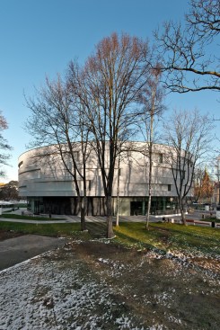 Specific location- center of the quarter, which is formed by different stylistics discordant buildings, presupposed a simple circular shape- the form that unites surrounding various periods of architecture. It’s round white facade not only gives sense of lightness to a relatively big volume of a building, but also highlights a valuable historic building- Palanga kurhauz, by forming a contrast background to it.
