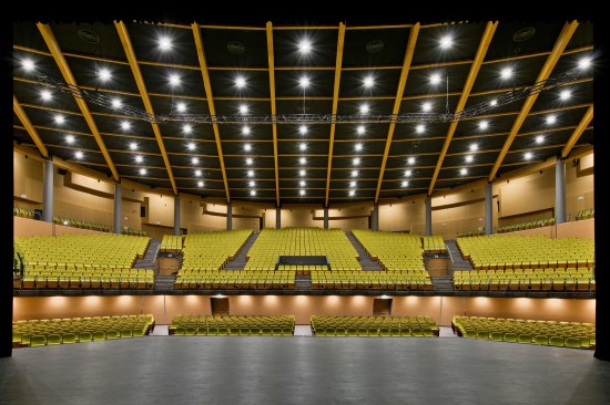 Interior of a 2200 seats main hall mostly dominated by brownish wooden beams, panels, green chairs and frame less glass railings combines a comfortable, soothing and modern atmosphere. Round shape of the hall allows good visibility of the stage even from the most distant seats. Reverberation time of 1,00 second and installed electronic acoustic enhancement system allows the hall to house events from classical music to pop concerts.