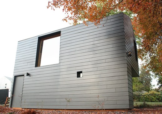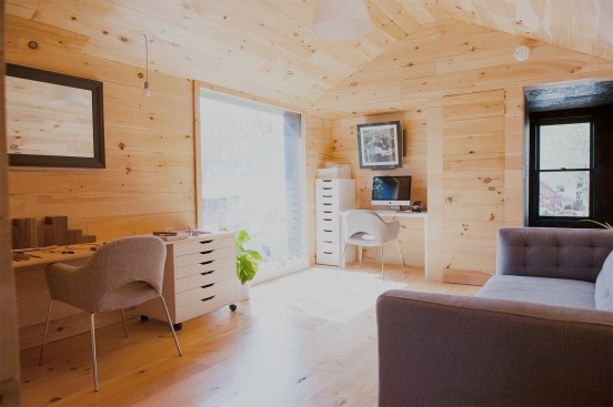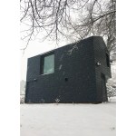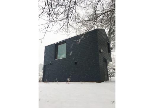 The Palatine Studio is a small backyard jewelry studio, wood shop, and guest cottage sited on a steep hill. With its gabled form and horizontal exterior cladding, the Palatine Studio is a vernacular reference to the neighborhood’s surrounding houses. This referential exterior form is then manipulated by outwardly sloping the east and north walls, creating an unexpected disruption to the form. Beyond this visual experience, the sloped walls compress the space above the eastern entrance path. The minimal sculptural details of the exterior not only shed the viewer’s assumptions of the form, but also draw the focus back to the simple experience of the form in its simplicity, and the space it inhabits. Upon entering the studio door threshold, the stairwell–painted the same color as the exterior, with the same slate chips–creates a material relationship to the exterior while also unfolding a notably tall space for such a small building. As the viewer ascends the stairwell, the space again compresses to the top, leading to a small opening filled with contrasting white light. This is the jewelry studio, which is open and lined–walls, floor, and ceiling–with white pine. The expansion of light continues, though, with a frame-less floor-to-ceiling window, which, when standing against it, draws the viewer’s perspective from the building itself to the view of a mountain beyond.