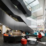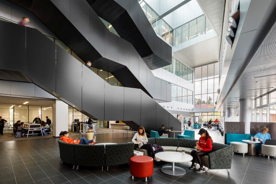 Each of the main components of the program occupies a separate floor, with the library functions located on the ground floor, for easy access; and sky level, where elevated views of the surrounding valley become a dramatic backdrop to reading areas and community rooms. The library is linked by the Academic Technology Center and Tutoring Center respectively in the middle floors.