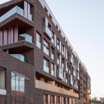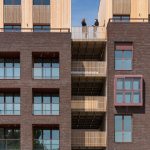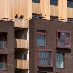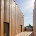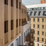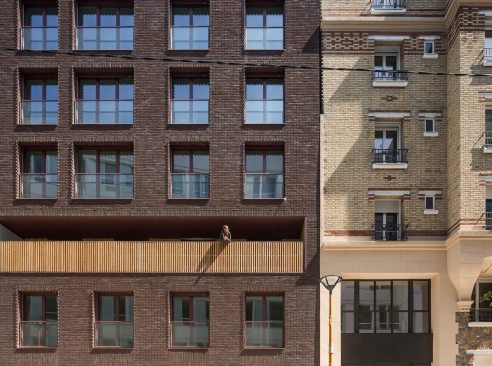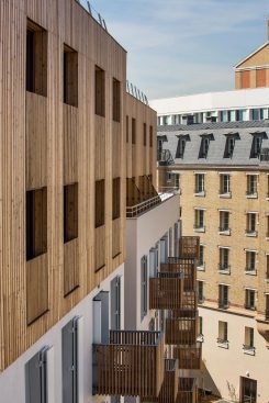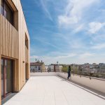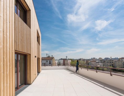 These gaps contain the accesses to apartments that are surmounted by wide and private terraces in wood clading as its essence. These generous openings animate, from the pedestrian’s point of view, the ways they go along.