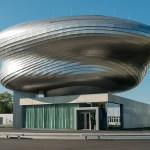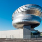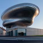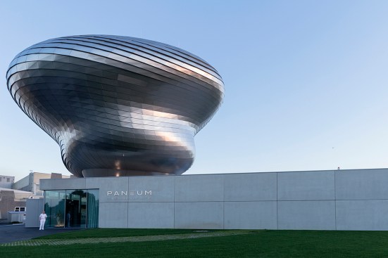 The Customer Information Centre and Event Forum PANEUM – Wunderkammer des Brotes – for the company Backaldrin in Asten consists of two elements: a box shaped plinth building with foyer and event rooms plus the “Wunderkammer des Brotes”, a two storey freeform exhibition area floating on top. The chosen materials augment the contrast of these two elements: The square base building shows a cast-in-place concrete façade while the rounded wood structure of the museum is clad with stainless steel shingles.