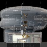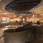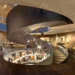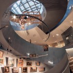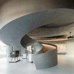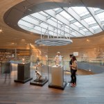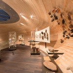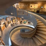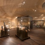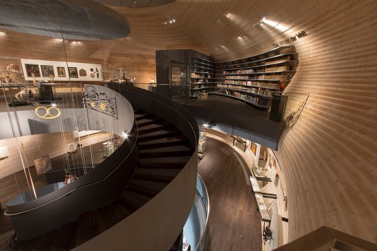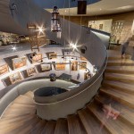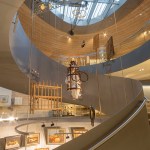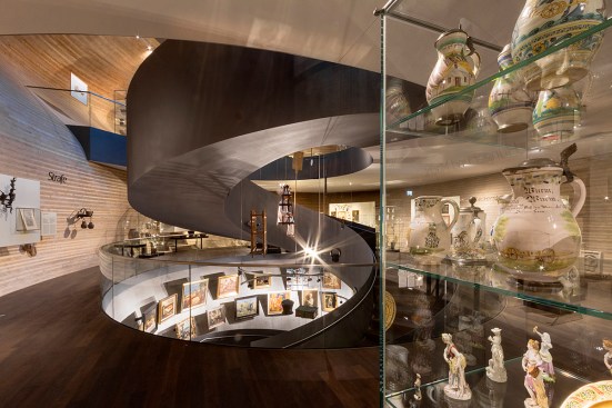 The centre of the “Wunderkammer des Brotes” is formed by a circular atrium, in which selected items from the collection are individually suspended from the top, as in a differentiated crystal chandelier. The atrium is enclosed by a spiral stair where visitors can look at the exhibited items from various perspectives. The stair provides access to the two exhibition levels, where the objects are presented with the help of walls, tables and cabinets that are integrated into the architecture. Additionally, all floors can be accessed by elevators. The atrium is naturally illuminated from above while the exhibition spaces have artificial light.