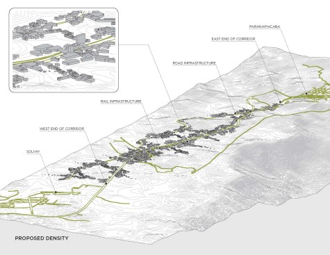 This landscape endures enormous development pressures from São Paulo’s growing population. Our plan recommends developing a linear city around the railway to connect Paranapiacaba to the nearest town on the railway, ultimately developing a rail connection to São Paulo. Our approach avoids sprawl by limiting development to the corridor surrounding the existing railway infrastructure and generates funding necessary for the historic preservation of Paranapiacaba. It will serve as a model for sustainable economic development by incorporating high-density towers and ecologically advanced practices for energy use, carbon emissions, waste accumulation, and water reclamation.