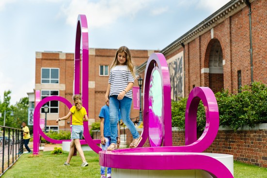 The design of pARC both mimics and challenges the Georgian-style architecture of the museum. It adopts the symmetrical composition and breaks it into a series of interconnected arcs. These series of arcs grow up from the ground to frame out various social spaces that allow the users to put their own identity onto the work, the museum, and the surrounding space. pARC becomes a flexible communal space evoking endless ways to play, gather, perform, teach, converse, or even take a nap. The spatial gesture takes on the user’s identity and utilizes its playable design to break down social barriers and spark communal connection within the space. The color of the work was designed in coordination with the rebranding of the Ackland to help draw people into the museum and serve as a connector to their new identity.