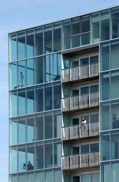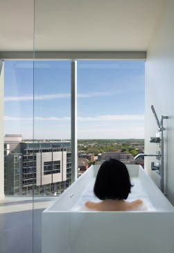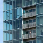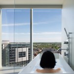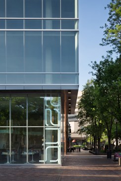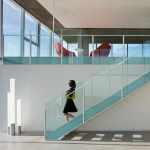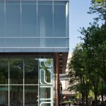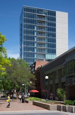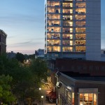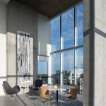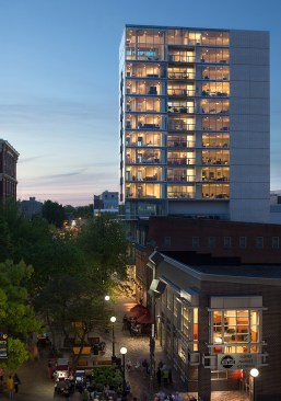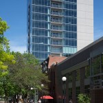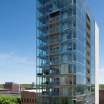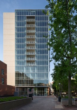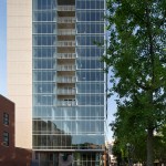 Diagrammatically representing the split between circulation and living spaces, the tower’s parti emphasizes verticality with opposing solid and transparent materiality. Concrete-formed masonry units clad the stair and elevator towers to the east, reflecting building levels with contrasting stringer courses at each floor line. Glass curtain wall wraps the western volume of the building from ground level to roof plane, rigorously organized into four foot panels and proportional to the structure itself.