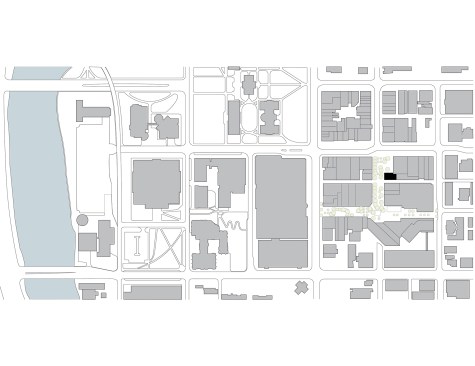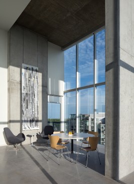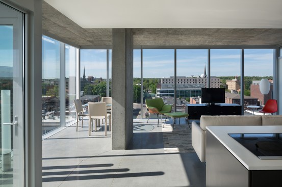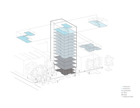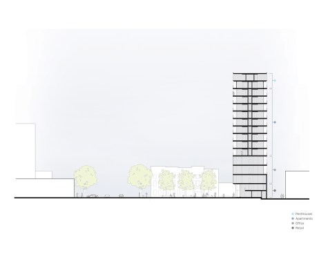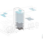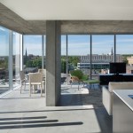 The building is entered from the city plaza to the north. The residential units, beginning on level five, include three standard types. Two mirrored units flanking the north and south are bisected by a larger unit to the west. Positioned at the top level, two double-height penthouse units interlock to provide each unit with views in three directions.