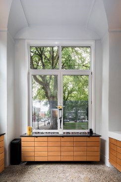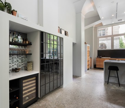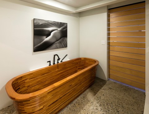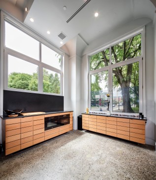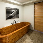 Along the beautiful tree-lined Park Blocks of the Pearl District in Portland, stands an old industrial building with a curious past. Built in 1909 by Bennes, Hendricks & Tobey architecture firm, what is now the North Park Lofts started out as the headquarters for the Blumauer-Frank Drug Company. In 1941, The Burnett Car Company purchased the building — which was already considered to be virtually bomb proof, due to being built out of super-reinforced concrete — and updated it with new wiring and automatic sprinklers, so that it laid claim to being the most fire-proof building in Portland. Because of the building’s incredibly high safety standards, in 1942 it was leased briefly by the Federal Reserve Bank of San Francisco to store personal and professional possessions for Japanese citizens that were being sent to interment camps. After changing ownership in the 1990’s, the building became known as the Artisan Building, housing artists, professional photographers, an art gallery and a deli. In 1997, Enterprise Development converted the existing 6 floors into lofts, and also added 4 additional floors. The commercial unit (formerly the main lobby and entrance for the building) went through several iterations — as creative office space and then an art gallery — before becoming Remedy Wine Bar in 2012. After 4 years in business, the wine bar closed, and Steve — one of the bar owners who also had purchased the commercial unit from the previous owner — decided to turn the property into his dream loft. Partnering with YBA Architects, and hiring Leif Warnberg as his General Contractor, Steve had a very precise vision for the functional design he wanted in the 1,100 square foot space. Being 7’ tall, Steve had long loved the soaring 18’ ceilings and historic windows, with spectacular views of the park. The layout is open and functional for a man of his height, with all of the kitchen and master bath counters designed and built 8” taller than standard, to a 42-inch height. Every square inch of the space was thoughtfully considered, including closets with slide-out shelving built to hold his size 17 shoes, and a pantry hidden behind custom-welded steel and mirror doors. All of the surfaces are either CaesarStone or PaperStone, and the spacious kitchen is equipped with Miele appliances (including side-by-side European-style speed and steam ovens), a Thermador induction stovetop that visually disappears into the counter, and a SubZero refrigerator with front paneling that matches the custom built Doug Fir cabinetry. Perhaps the most spectacular piece, however, is the 8’ long handcrafted Fiji Mahogany wood tub that Leif built at the conclusion of the project, layering each tier upon the previous one and then sealing it with resin, much like one would build a boat. The owner has a love for unique, one-of-a-kind spaces, and this elegant dream loft is no exception!