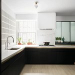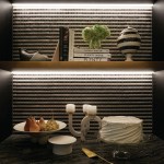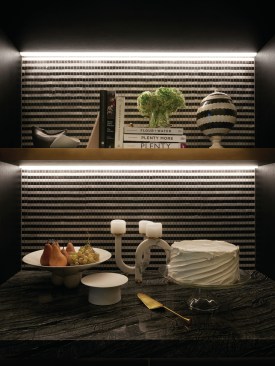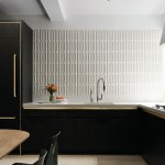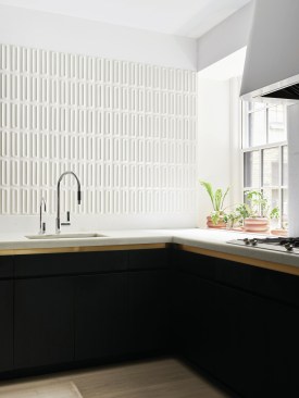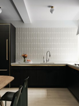 To create a light-filled kitchen where there was only one window facing a courtyard, Chen relied on high-contrast materials. The lacquer and ebonized oak pantry links the dining room and kitchen, which is lined in glossy three-dimensional tile from Ann Sacks, and pale iridescent wall covering from Flat Vernacular. “We wanted to catch as much light as we could with the glossy molded tiles,” says Chen, “There is always a play of light and shadow along the wall because of the three dimensional texture”.