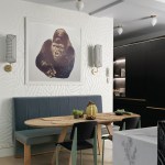 Overhead upper cabinets were banished in favor of multiple voluminous full height cabinets in the pantry where the majority of service-ware and dry goods are stored. Plentiful drawers below the white marble countertops provide ample storage for everything else. Under the glass partition, a thick counter of striped Kenya Black marble adds to the material contrast, and doubles as a bar top and work surface when the glass partition is slid away. An Enzo Mari gorilla print overlooks the dining table, flanked by fabric sconces by Erich Ginder. Overhead an array of fixtures by Michael Anastassiades, from The Future Perfect provides ample task lighting.