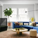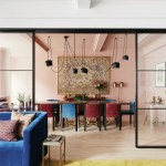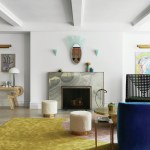 In the living and dining rooms, a tiny door opening was substantially enlarged and infilled with a black metal and glass sliding partition creating a generous portal between the two spaces. Facing the doors, a grey onyx and bronze fireplace mantel is flanked by turquoise glass sconces with a vintage Fontana Arte mirror above. A massive circular custom sofa designed by MKCA is upholstered in a bright blue synthetic textile from Maharam. “The round form was so useful,” says Chen. “We intended the sofa to be the centerpiece of the room, and be large enough for the whole family to plop down, and to transition between intimate conversation and full-blown party mode, which is does really well.” A sculptural chair by Charles Rennie Mackintosh and poufs upholstered in shaggy mohair surround a vintage brass table. A bone console, sculptural stainless steel shelving unit by François Monnet, and linen wrapped game table complete the room. A painting by artist Ilona Savdie, and drawings by Karin Haas hang adjacent to the fireplace. A carpet by MKCA is made from joining two shapes of broadloom synthetic silk together.