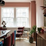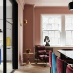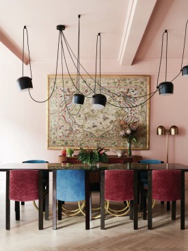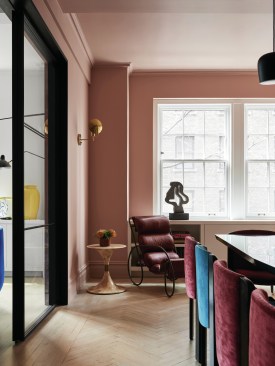 The dining room is shrouded in a desaturated pink paint and anchored by an eleven-foot custom table in high gloss lacquer, steel, and gold leaf from Los Angeles designers Alex Drew and No One, show stopping yet visually very light. The table is surrounded by vintage Joe Colombo dining chairs in their original well-worn fabric, and a pair of voluptuous leather and steel lounge chairs are used by the family to have coffee in the morning and to read after dinner. A massive vintage chinoiserie panel, chosen by the client at Housing Works, hangs above the vintage Henry Glass sideboard from Converso, beautifully integrating all of the colors of the room. “The very best kinds of client collaborations are when we are asked to push the clients a little past their comfort zone, and when they do the same to us”, Chen says of the juxtaposition.