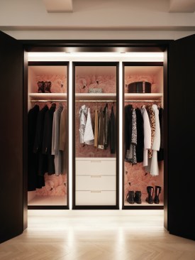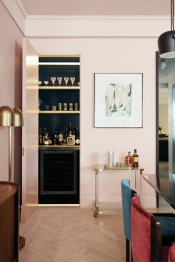 Off of the gallery, MKCA created a powder room and cloak room duet. The sleek and moody new powder room inhabits a former closet, and is lined from floor to ceiling in handmade metallic black tiles from Heath Ceramics and features a floating custom console of barely pink Rosa Aurora stone, lacquer, and smoke mirror, conjuring images of nightclub naughtiness. In contrast, the generous new cloak room across the gallery boasts powdery pink lacquer built-ins, integrated LED lighting, and puffy flamingo wallpaper, projecting a sunny and playful disposition. The cloak room absorbs baby strollers, shoes, and coats for the family and their guests in crisply detailed millwork compartments.