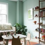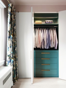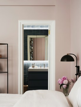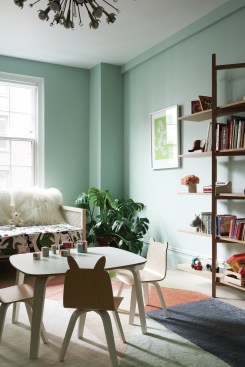 An inky blue-green back hall leads to three bedrooms. In the couple’s daughter’s room, the tropical motifs from the front of the apartment mingle with Scandinavian sensibilities. Sheepskin pillows dominate a CB2 daybed with a custom cushion, upholstered in a Josef Frank botanical print. A vintage teak rocker by Finn Juhl, tall shelving from Hem, and a coterie of animal-cum-footstool pieces from Kinder Modern surround the daughter’s play and drawing table.
