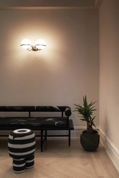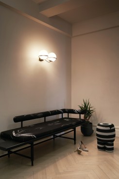The master bedroom and bath were touched lightly, with the addition of custom millwork his and hers closets, and new finishes and fixtures in the master bath. A vintage shelving unit by Frederick Weinberg sourced from eBay holds vintage ceramics and books that the couple collect, and the couple’s bed is flanked by vintage nightstands by Luigi Caccia Dominioni for Azucena, sourced from Compasso Gallery; and custom sconces by Allied Maker.
