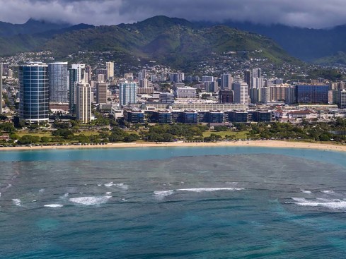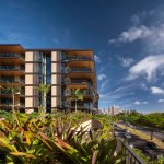 With a prime location and unparalleled views, Park Lane Ala Moana is a 1.5 million-square-foot, 217-unit condominium development in Honolulu. The eight-story, eight-building development was conceived as a linear series of larger homes, each centered around landscaped courtyards to offer all residents ocean views. The buildings are bound together by a shared “Park Lane” path, from which the project draws its name. SCB used two levels of parking along the mauka (mountain) side to create topography on the site, allowing the buildings to step down towards the ocean and create a series of lush, landscaped terraces. Vertical lines such as stacked balconies are offset wherever possible to enhance the horizontal expression of the quarter-mile-long project, allowing the structures to retain an intimate, human scale. The entire project radiates from a central open-air lobby and faces makai (ocean), revealing the vista as it steps down; its edge is carefully designed to blend with the park beyond, offering a connection to the land and ultimately the ocean. All of the residences enjoy ample daylight, a strong connection to the outdoors, and expansive makai views through floor-to-ceiling windows. Multi-panel glass sliding doors glide along tracks set flush in the floor to open up full walls to generous lanais, seamlessly integrating the indoor and outdoor living experience. Glass guardrails allow for unobstructed views, and acoustic wood-paneled ceilings lessen ambient noise from the city. A palette of natural materials in warm tones is used on the exterior of the buildings. Sandstone, dark bronze, anodized copper, and deep-colored high-performance glazing are softened with wooden soffits and limestone rubble walls that add texture to the composition. Horizontal sunshades along the makai façade reduce solar gain, as do the vertical shades along the east and west, which also shield sightlines between residences. The amenities at Park Lane Ala Moana are designed to foster a feeling of community between residents. The Park Lane is a shaded, lush, art-walk that runs along the full length of the mauka edge of the project at level five, the main level of the development. The Park Lane is the primary circulatory path for moving between buildings, the lobby and drop off, and to the main amenity area. While each courtyard features private pools and hot tubs, the development’s main amenity area includes a modern fitness center with private training and yoga studios, private dining cabanas, a screening room, a club room, and a wine bar that offers temperature-controlled bottle storage for residents. A private and discreet elevator from the Park Lane provides convenient access to the luxury retail shops of Ala Moana Center, Hawaii’s largest open-air mall.