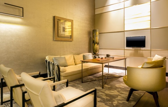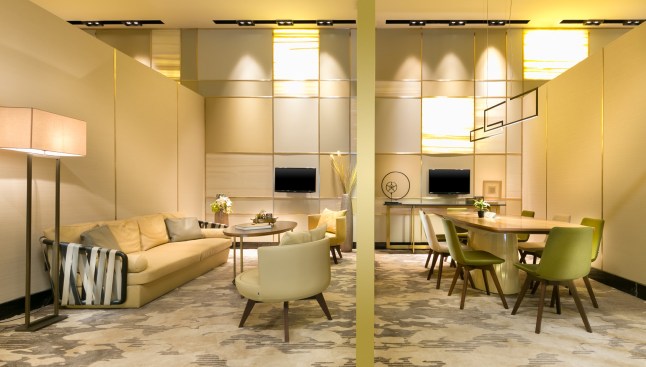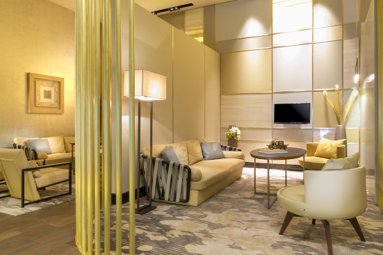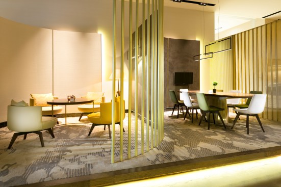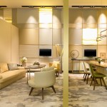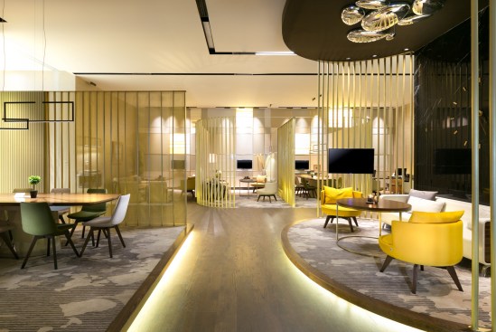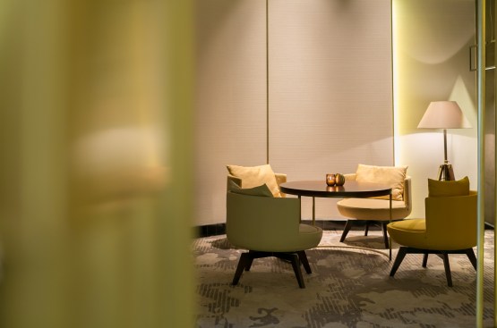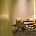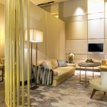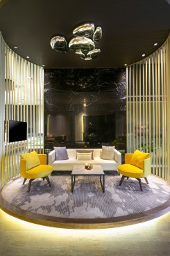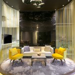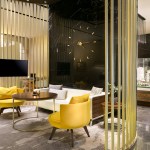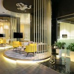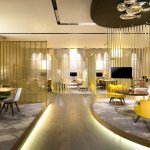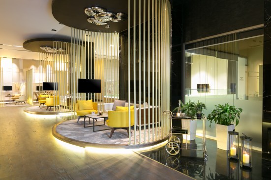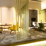 Towards the corporate identity and the projects concept, color palette contains mostly greens, yellows and warm whites. The ambiance also got enriched and upscaled with materials such as brass, backlighted onyx and black marbles.