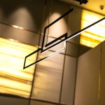 The main decorative wall is covered with silk fabric, leather, backlighted onyx marble and brass profiles. Black metal accesories are contrasting and eye catching.