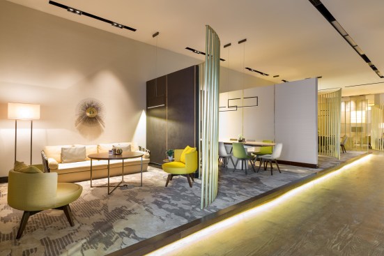 Instead of distancing seller and the guest by placing a work desk between them, cosy lodges are designed. Lodges vary in furnishing as dining concepts or lounge style sitting settlements. Sales persons are fully mobile, they are using laptops and catalogues during the presentations and screens for presentations are installed.