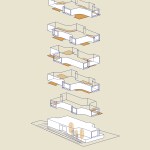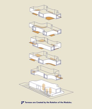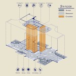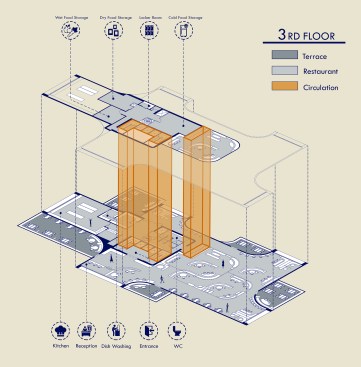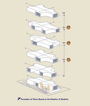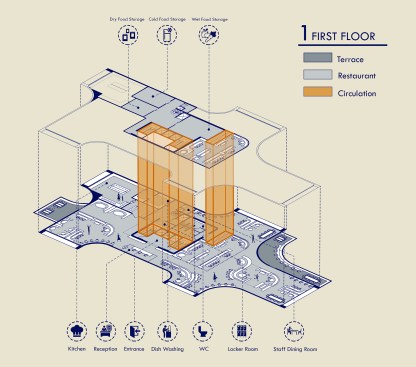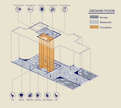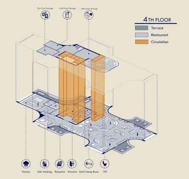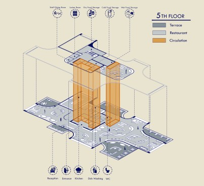The rotation of the volumes in different directions on the floors creates formal stretches that seem to tend the attraction points and help to improve the quality of important views around the site on each restaurant floor and creating a dynamic process between form and function
