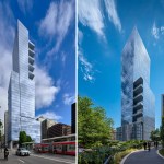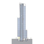 The tower’s façade is composed of floor-to-ceiling glass and is articulated with vertical glass fins that relate to the location of the tower terraces, which occur at a three-story module. The podium façade also utilizes a series of single-floor fins to break down the scale at the pedestrian level. The fritted pattern is repeated through to the base of the building to help continue the tower articulation and materiality throughout the overall massing.