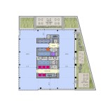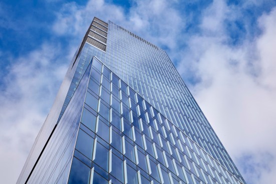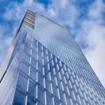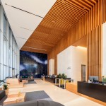 At the base of the tower is a covered 3,600-square-foot outdoor plaza with a 35-foot-high ceiling. The area is designated as privately owned public outdoor space (POPOS) that abuts both the tower’s main lobby and adjoining retail space. Along with a series of outdoor seating areas, a major focal point of this outdoor space is a large, site-specific art installation, entitled “Night Writing” by Teresita Fernandez, which is integrated into the main wall of the tower’s core.