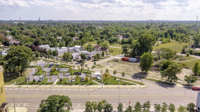 Detroit’s long and tortured love affair with the automobile—at once a driver of the city’s economic might and an engine of destruction for its urban fabric—is the thematic backdrop for PARK(ing), a public space that makes equal accommodation for people and their cars. Created by Charlottesville, Va.–based D.I.R.T. Studio in collaboration with local Detroit developer Prince Concepts, the project occupies what had been an asphalt-surfaced, open-air parking lot on the periphery of Core City Park, a 21,000-square-foot green space completed in 2019. D.I.R.T.’s objective was to allow continued convenient access to the park by visitors living beyond walking distance, while also assimilating the car park into the overall design scheme, making it an extension of the natural landscape rather than a mere concession to the city’s car culture.